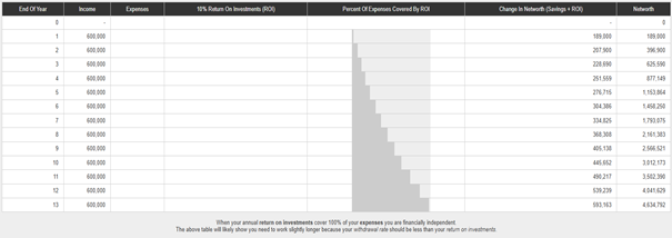 Uzun vadeli ve kararlı bir şekilde her ay düzenli maaşınızdan tasarruf ederek yapacağınız yatırımlar sizi finansal özgür yapabilir. Finansal özgürlük için tasarruf oranınız ve miktarınız önemlidir. Yani küçük paralarla yatırımla zengin olmazsınız ancak finansal özgürlük kavramında maaşınız kadar pasif gelire ulaşacağınız yılı hesaplayacağız. Önce maaşınızı kendiniz kazanacaksınız ve emeklilik paranız da işin bonusu olacak. Aynı yıl aynı geliri üretmek için tüm maaş miktarlarında geçerlidir ancak biz aylık 50.000 TL kazanan için örnek hesaplama yaptığımızda tabloda göreceğiniz üzere yüzde 30 birikim ve % 10 reel kazancı olan bir portföyle 12,6 yılda kendi geliriniz kadar bir gelire sahip olabilirsiniz. Reel kazanç dediğimiz enflasyon oranı üzerinde ekstra % 10 olduğu için yatırımlarımızın enflasyona yenilmeyeceği için enflasyondan arındırmış oluyoruz.