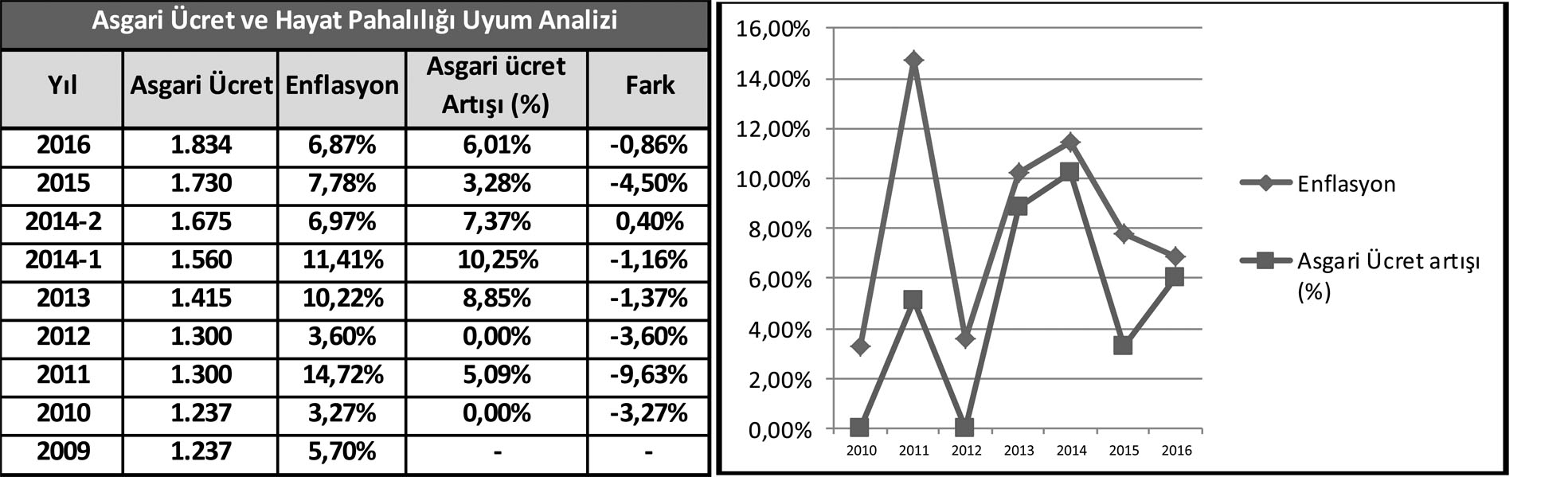 Asgari Ücret Saptama Komisyonu 21 Haziran 2016 tarihinde yeni asgari ücreti 1.834 TL olarak saptadı. Karar işveren ve devlet kanadının oylarıyla belirlendi. Buna göre saatlik ücret 10.58 TL, günlük ücret 84.65 TL ve haftalık ücret de 423.23 TL oldu. İşçi kanadı saptanan yeni ücrete tepki göstererek masayı terk etti. Akabinde Türk-sen, Bank-sen, KTAMS gibi diğer sendikalardan ve TKP, YKP gibi siyasi partilerden % 6 artış oranına eleştiriler geldi. Eleştirilerin boyutunu ve haklılığını incelemek adına aşağıdaki tabloda görüleceği üzere asgari ücret artış oranlarını hayat pahalılığı göstergesi olan yıllık enflasyon oranları ile kıyaslayalım. Böylelikle son 7 yıldır hayat pahalılığının asgari ücret zamlarının üzerinde seyrettiğini gözlemliyoruz. Buda son yedi yıldır asgari ücretlinin her sene alım gücünün düşerek enflasyona yenik düştüğünün açık bir göstergesidir. Tabi her maaşlı kesimin maaş bandını bilemeyeceğimiz için sizin aldığınız zam oranlarını aşağıdaki tabloda ibraz edilen enflasyon oranlarıyla kıyaslarsanız maaşınızın hayat pahalılığı dahil edilmiş şekilde reel maaş artışınızı ölçmüş olursunuz. Bu durum ülke ekonomisine yarar sağlamamaktadır. Alım gücü hızla düşen işçilerin tüketimi azaltması haliyle üretimi ve ticaret hacmini kısıtlandırmakta ve ekonomik küçülmeyi teşvik etmektedir.