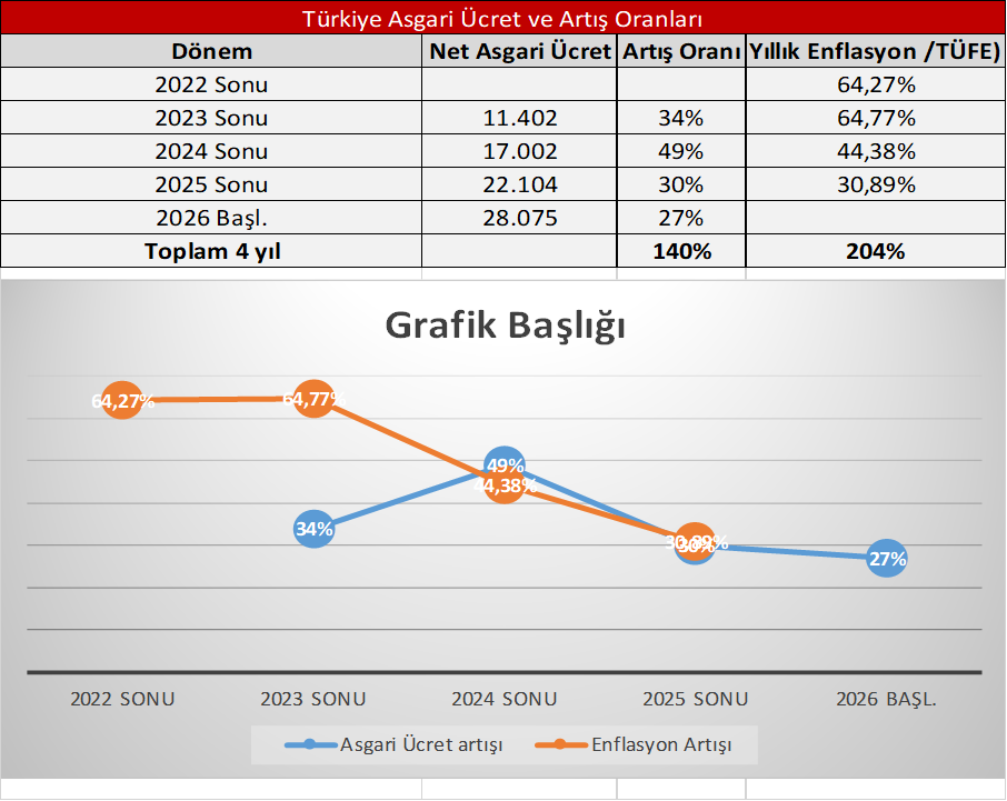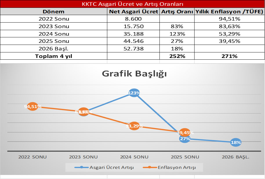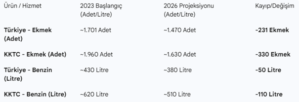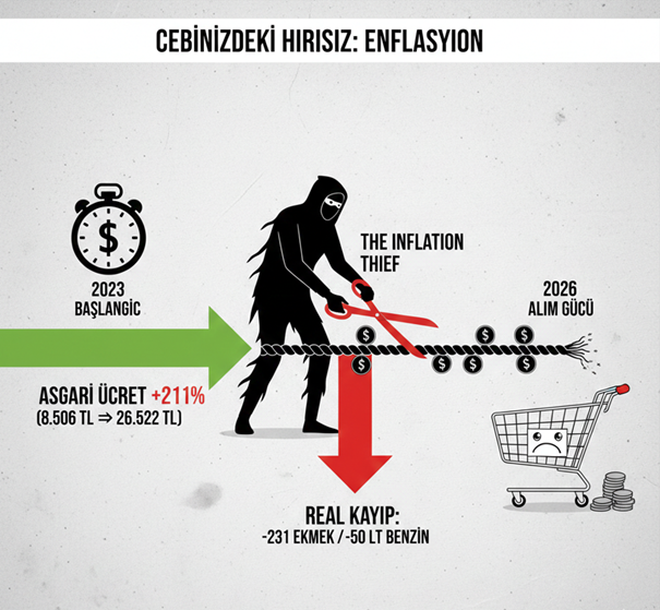4 yıllık zaman zarfında Türkiye’de kümülatif enflasyon yüzde 204 artarken, asgari ücret zamları ise yüzde 140’ını karşılamış ve aradaki fark alım gücünü düşürmüştür. KKTC’de ise 4 yıllık kümülatif enflasyon yüzde 271’e tekabül ederken maaş zammı artış oranı yüzde 252 olmuş ve Türkiye’ye nazaran vatandaş enflasyona karşı daha az ezilmiştir. 2026 yılındaki bir asgari ücretli, 2023 yılındaki asgari ücretliye göre mutfağına daha az ekmek, deposuna daha az yakıt koyabiliyor. İşte "hırsız" tam olarak bu aradaki farkı çalıyor.