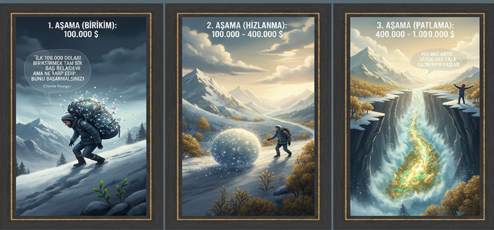 3. Aşama (Patlama): 400.000 – 1.000.000 dolar. O top yamaçtan aşağı yuvarlanır ve önüne geçilemez bir çığa dönüştüğü zamandır. Burası matematiğin mantığa meydan okuduğu aşamadır. Paranız artık sizden daha fazla kazanmaya başlar. Sonuç olarak İlk 100.000 doları yapmak için 7 – 10 yıl harcamışken bu aşamada ilk zorlandığınız parayı aylar içerisinde yatırımlardan kazanabilirsiniz.