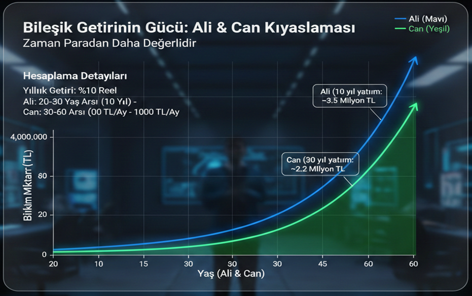 Bu tablodaki en çarpıcı nokta, Can'ın Ali'den 3 kat daha fazla anapara yatırmasına ve 3 kat daha uzun süre boyunca tasarruf yapmasına rağmen, Ali'nin gerisinde kalmasıdır. Bunun temel sebebi şudur: Ali'nin ilk 10 yılda biriktirdiği tutar, Can henüz yatırıma başlamadan önce 10 yıl boyunca bileşik getiriyle büyümeye başlamıştı. Ali yatırımı bıraktığında, elindeki "kartopu" zaten o kadar büyümüştü ki, Can'ın 30 yıl boyunca eklediği küçük tutarlar bu devasa büyüme hızına yetişemedi.