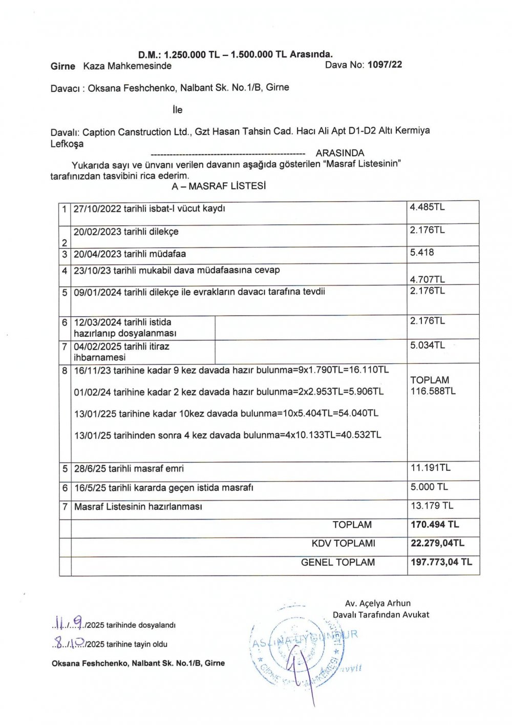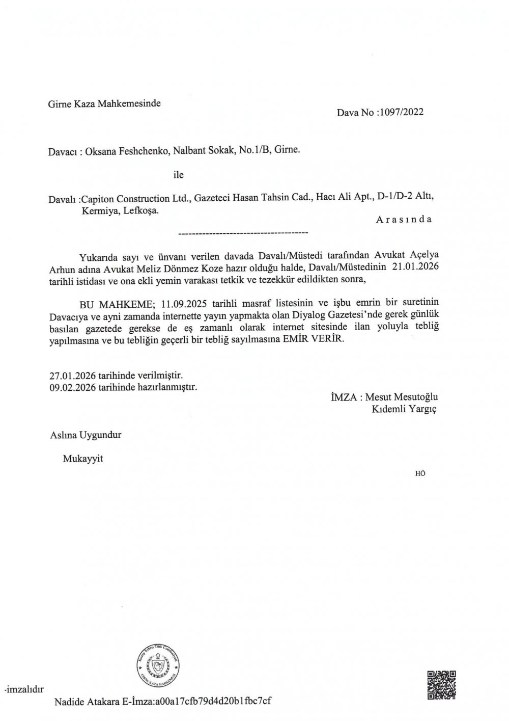 Girne Kaza Mahkemesi Dava No: 1097/ 2022