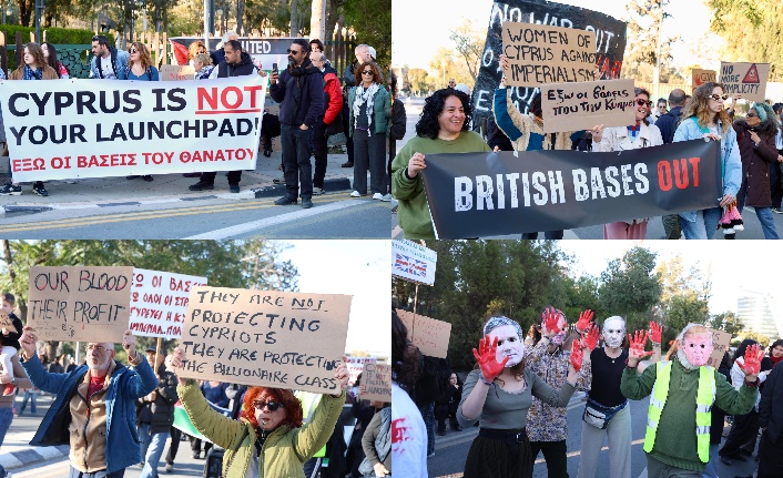 Eylemciler, adadaki yabancı askeri varlığın Kıbrıs’ı bölgesel çatışmaların hedefi haline getirdiğini savunarak İngiliz üslerinin kapatılmasını ve ülkenin askeri operasyonlarda kullanılmamasını talep etti.