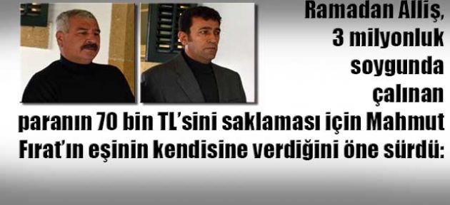 Alliş, daha sonra telefonu çaldığını ve Mahmut’un Eşi Meryem Fırat’ın aradığını, buluşmak istediğini ve görüştüklerini anlattı. Alliş, Meryem Fırat’ın naylona sarılı bir paket verip saklamasını istediğini, paketi alıp bahçeye gömdüğünü daha sonrada olayın patlak vermesi üzerine polisi götürüp paketin yerini gösterdiğini ve paraların ortaya çıktığını belirtti. Mahmut Fırat ise polise verdiği ifadenin tam tersi yönünde mahkemede konuşurken, iddia makamı tanık olarak dinlenen sanığın diğer sanıklarla akrabalık bağı olduğunu ifade etti. İddia makamı Mahmut Fırat’ı sorguladı.