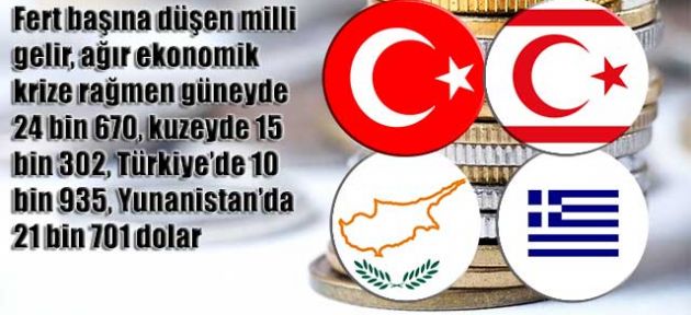 Kuzey Kıbrıs’ta fert başına düşen milli gelirin 2013’te 15 bin 302 dolara yükseldiği belirtildi. Aynı yıl, ağır ekonomik krize karşın güneydeki gelir ise 24 bin 670 dolar olarak gerçekleşti.