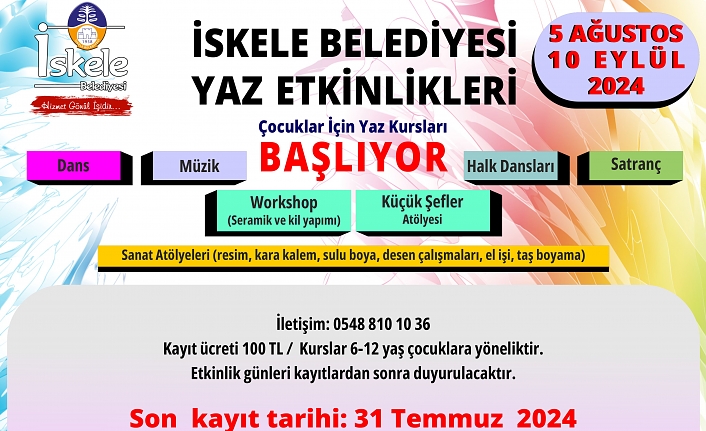 Modern dans, müzik, satranç, halk dansları, küçük şefler atölyesi, workshop (seramik ve kil yapımı), sanat atölyeleri (resim, kara kalem, sulu boya, desen çalışması, el işi, taş boyama) gibi birçok aktivitenin yer aldığı İskele Belediyesi yaz etkinlikleri tamamlandığında, çocuklara, katılım belgeleri takdim edilecek.
