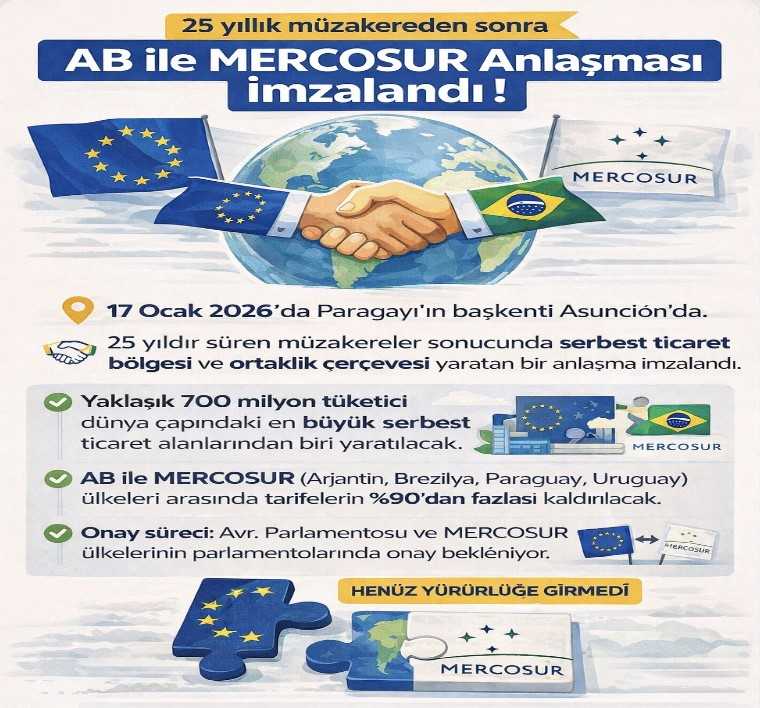 Trump bunları yaparken Avrupa Birliği ile MERCOSUR topluluğu arasında dev bir anlaşma imzalandı. Avrupa’daki çiftçiler bu anlaşmadan zarar görecekleri gerekçesi ile ayaklandılar ama AB liderleri bu kararlarından dönmek niyetinde değiller. 17 Ocak’ta Paraguay’ın başkenti Asunción’da AB ve MERCOSUR arasında imzalanan bu anlaşma yaklaşık 25 yıldır süren müzakerelerin bir sonucudur.