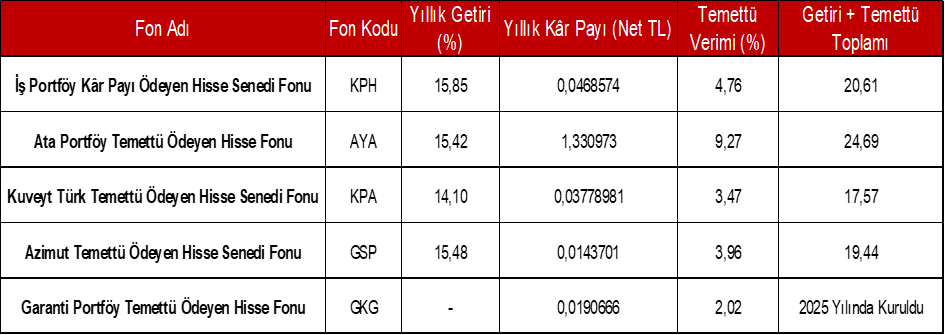 Kar payı ödeyen hisse yoğun fonlar, portföy yönetim şirketleri tarafından profesyonel yönetilen ve ana stratejisi kâr payı (temettü) dağıtan şirketlerin hisse senetlerine yatırım yapmak olan yatırım fonlarıdır. Türkiye bankaları üzerinden yatırım hesabı açarak elde edebileceğiniz bu fon çeşitleri 5 portföy şirketinde mevcuttur. Bu fonları aşağıdaki tabloda göreceğiniz üzere 5 ana madde halinde sıralayabiliriz; Son 5 yıllık performansları temettüler haricinde 9-10 kat yükseliş göstermiştir. (TEFAS sisteminden görebilirsiniz). Ancak Türk borsasının 2 yıldır yüksek faiz ortamında olduğu için borsanın ve bu fonların performansından baskılanmıştır. Bu çerçevede cari yılda fonlar hisse senedi artışından % 15 civarında getiri sağlarken % 4 - % 9,27 arasında nakdi temettü ödeyerek yatırımcılarının hesabına nakit para yatırmışlardır. Ata Portföy ve Azimut portföyün fonları önceki yıllara dayanırken, kurumsal itibarı olan İş portföy kar payı ödeyen fonunu 2024’de açmış ve Garanti Portföy ise 2025 yılında böyle bir fon oluşturmuştur. Dolayısıyla nakit temettü ödeyen fonlar artış trendi içerisindedir.